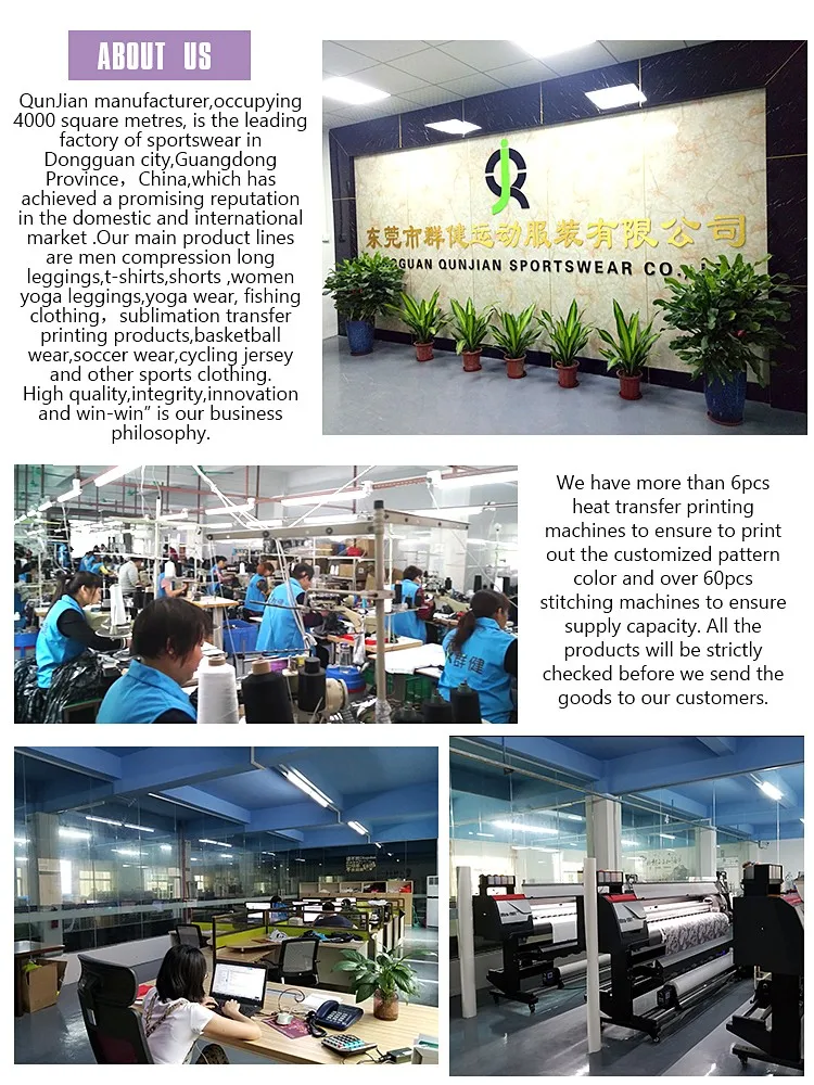 We are Dongguan QunJian Sports Apparel Factory, a manufacturer of fitness wear and focus on manufacturing various compression fitness shirts,long leggings, shorts, yoga pants, yoga shorts, tank tops,basketball jersey,soccer jersey etc. We are able to supply you with top quality and perfect workmanship OEM and ODM products.