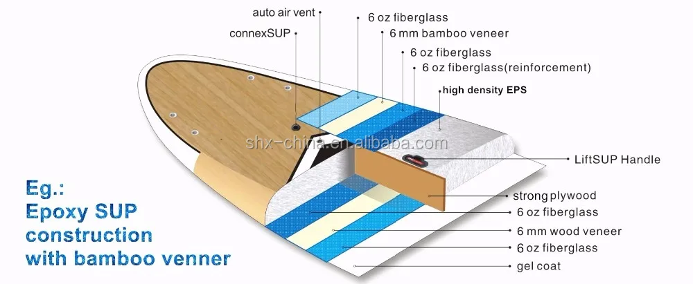 Deck-Paint, wood, bamboo, blunk, carbon + Core-EPS Foam + Inside layer -Full layer of Epoxy + Bottom-Paint + Inside-Stringer