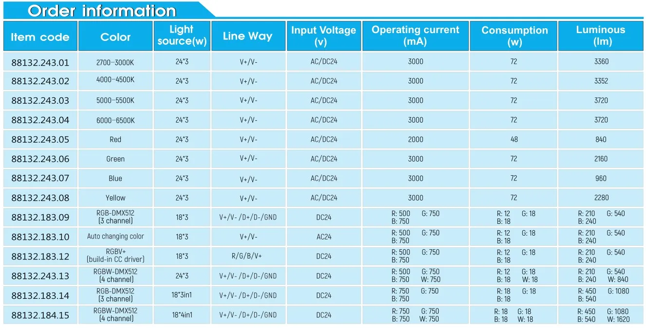 LED Q’ty: | 18pcs 3W LED / 18pcs 3in1 LED / 18pcs 4in1 LED / 24pcs 3W LED | ||||||