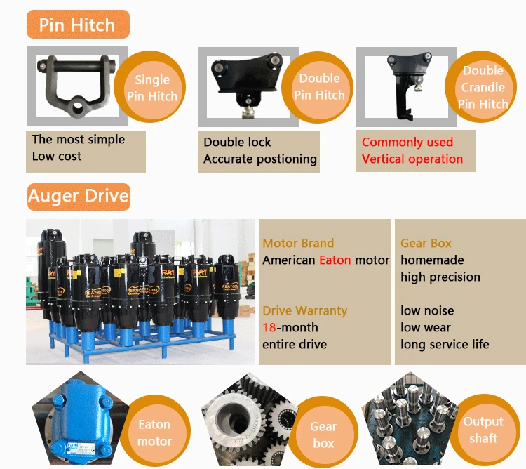 (1) Single pin hitch is the most simple and low cost one. (2) Double pin hitch has double lock and can accurate positioning. (3) Double pin cradle hitch is the most security one, which can keep the earth auger vertical to the ground when it operated.