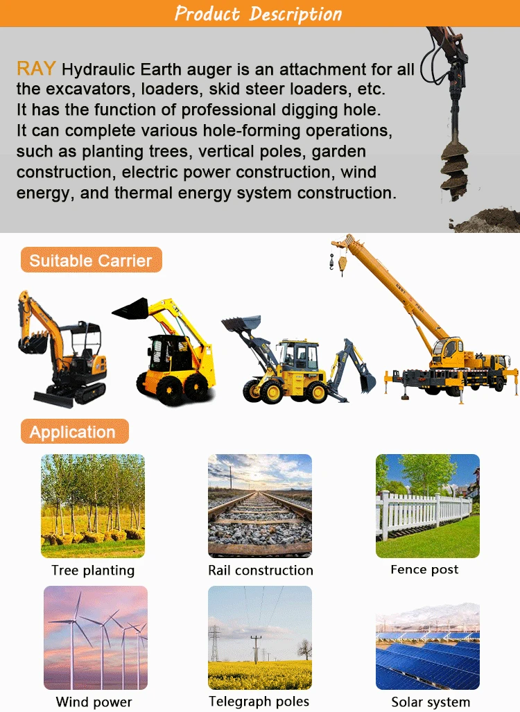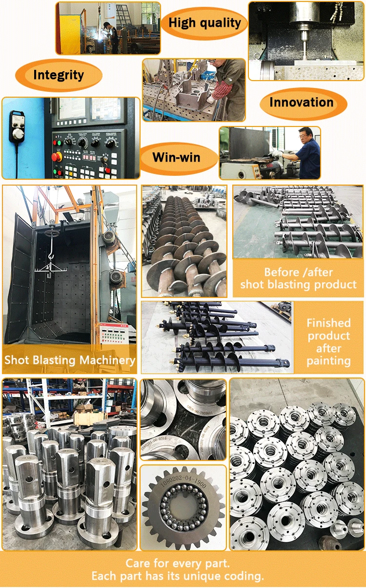 Auger Drive is the heart of earth auger. We adopt imported motor to ensure its quality. It is divided into two major parts, Motor and gear. The motor from American Eaton, brand quality assurance. And we ensure the quality of the auger drive of 18 months warranty. 1.Forged hoods ears: Deal with the heavy strain of daily use.Contact surface wider and safer. 2.Eaton Motor: Developing the most reliable attachments. 3.ERICYLIC gearbox: Unique planetary gearbox.Multiplied output torque. Extreme efficiency 4.NON-dislodgement shaft: Assembled top down locked into earth drill house.Never fall out.Provided a safer environment. Pay attention: We have independently developed a tungsten tooth and have a patent (patent no: 201520425163.4) .