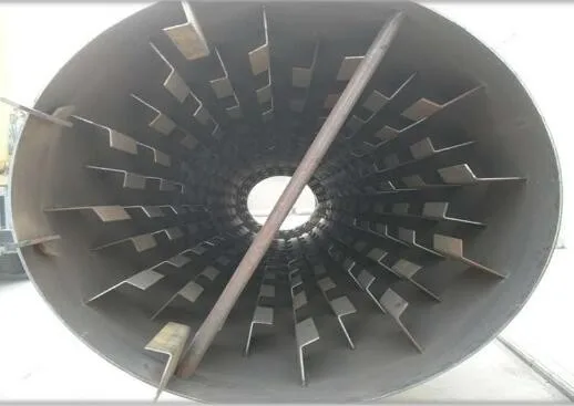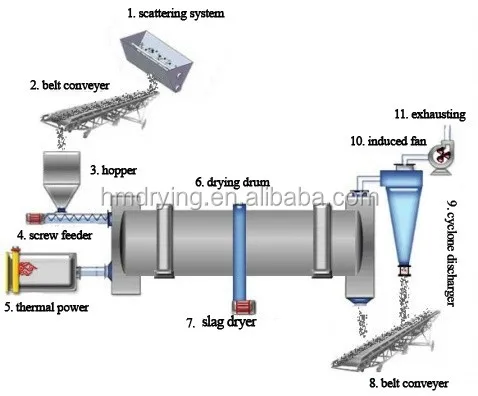 Rotary dryer adopts direct flow type of heating with heat soure from firing unit. The material to be dried is pushed back immindiately by spiral board when enters the shell from feeding tank and feeding chute. Because the drier is installed in slope, material flows to the back end under gravity and rotation force, meanwhile, it is lifted by board repeatedly and thrown down accordingly, which make the material form even curtain, and exchange heat sufficiently with inner the heat flow. In the end, water in the material is dried by repeatedly scattering.