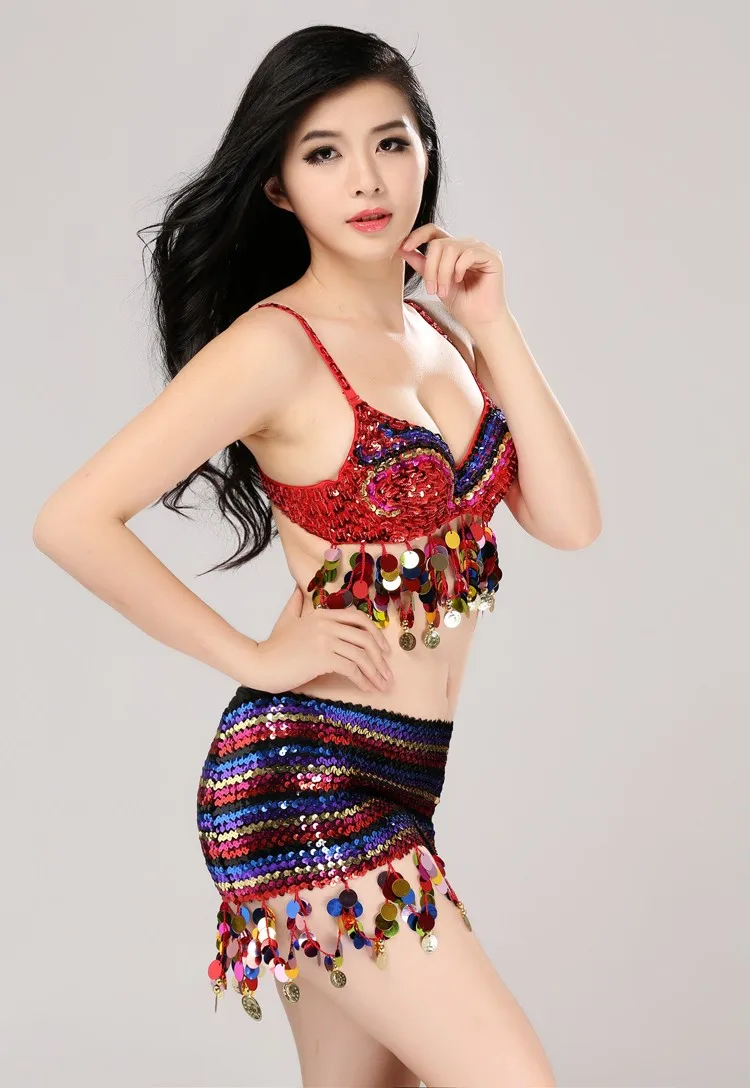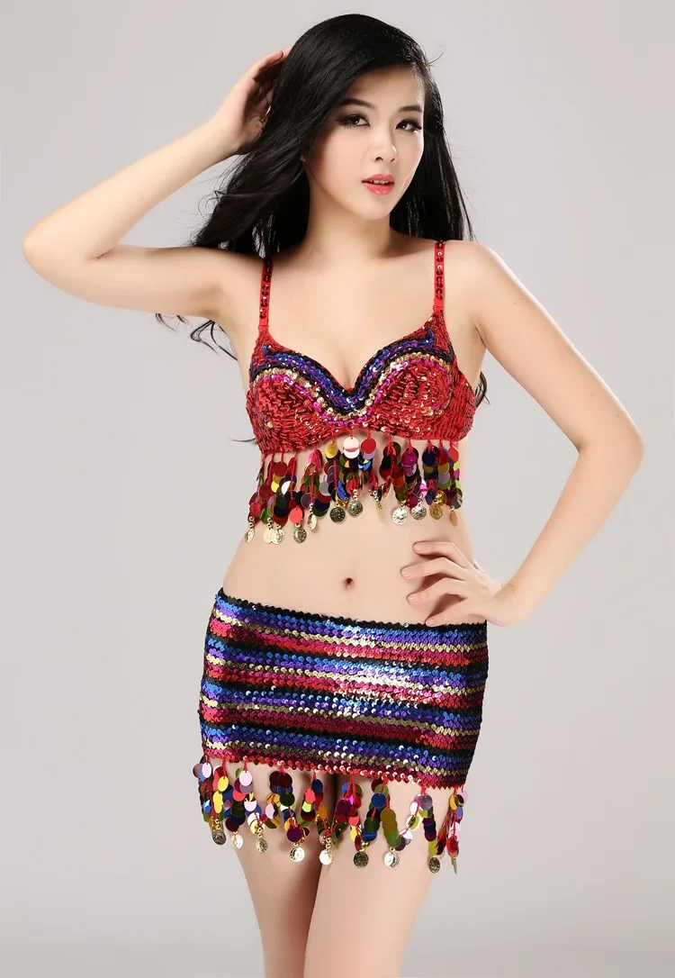 Cheap New Sequins Bra Hip Scarf Set Women Dance Costume Stage Wear Belly Performance Costumes