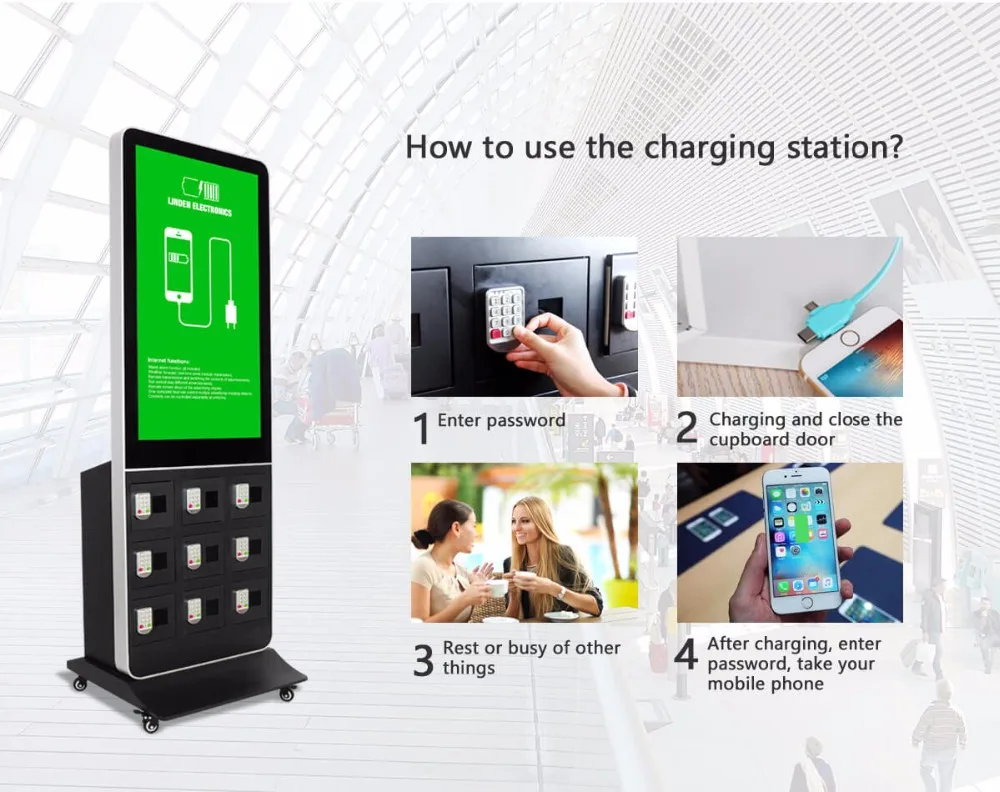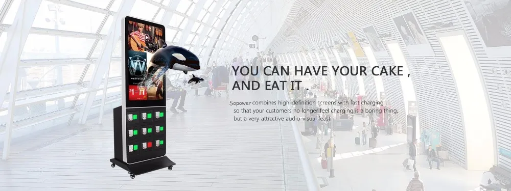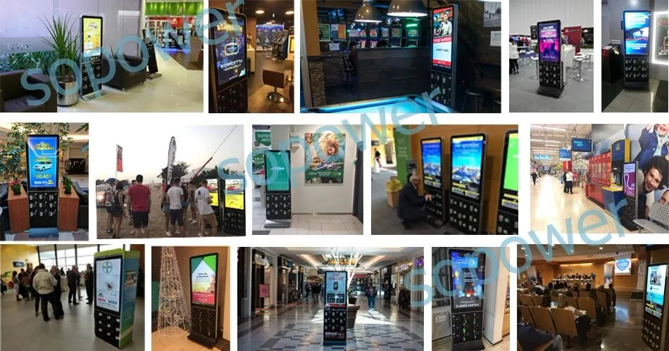 SOPOWER network advertising cell phone charging station is an innovative product that integrates digital locker, phone charger and advertising display as "three-in-one",so that people can have their cell phone charged and locked for anti-theft, they can either stay there watching advertising video or walk away to buy a Newspaper, coffee or hamburger. This Phone Charging Machine With remote control /touch screen also can be used as an display LCD , it mainly targeted for self-service cell phone charge in unsupervised or semi-supervised positions. such as tourism, health care, hospitals, restaurants, financial services, shopping malls, universities, airports, gas stations, railway stations and other public areas.