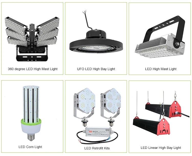 Our main products are LED Corn Bulbs,LED Retrofit Kits,LED Low bay light,LED Canopy Light , UFO LED High Bay Lights,Linear LED High Bay Lights,LED Shoebox Lights,LED Area Lights and LED Floodlights.