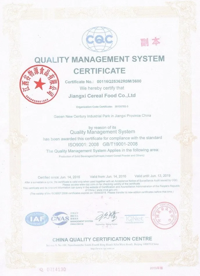 Jiangxi Cereal Food Co., Ltd., cereal products manufacturers/Suppliers; all of them can be cooked Instant rice porridge ; is made by latest Prgelatinized +Drum drying roller/Puffed Craftwork, choosing Pure wheat, corn, rice as main ingredients. It is health, Natural and Nutrition breakfast food; and can be used in Solid Beverage, Bakery, Snack food, Cereal bar, Candy, Chocolate bar, Health food and so on.