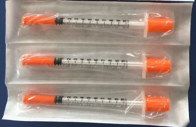 Application: Used in under patient's skin , the vein and intramuscular injection, etc. Models: U-40, U-100 Description: clear syringe barrel with accurate graduation, Sterilized by ETO gas, pyrogen-free. needls:27-30G residues less than 0.01ml smooth plunger motion, medical grade PP material. Package: individually poly bag packing or blister packing, the secondary packing could be poly bag or box, outer packing could be standard corrugated carton.