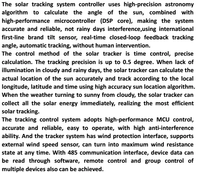 Solar Tracker uses the international brand tilt sensor, intelligent identification of rotation angle, without manual debugging angle.