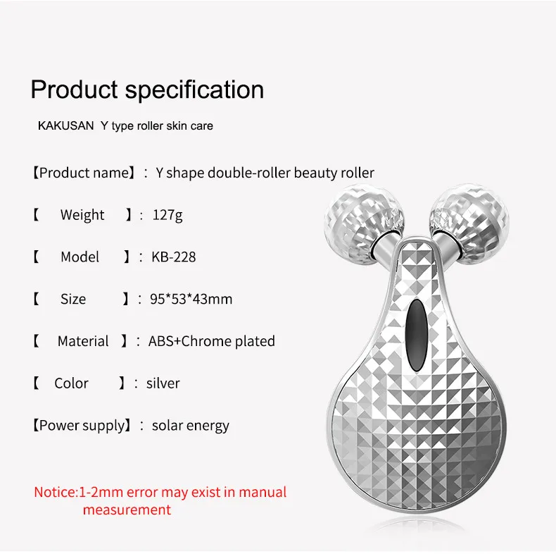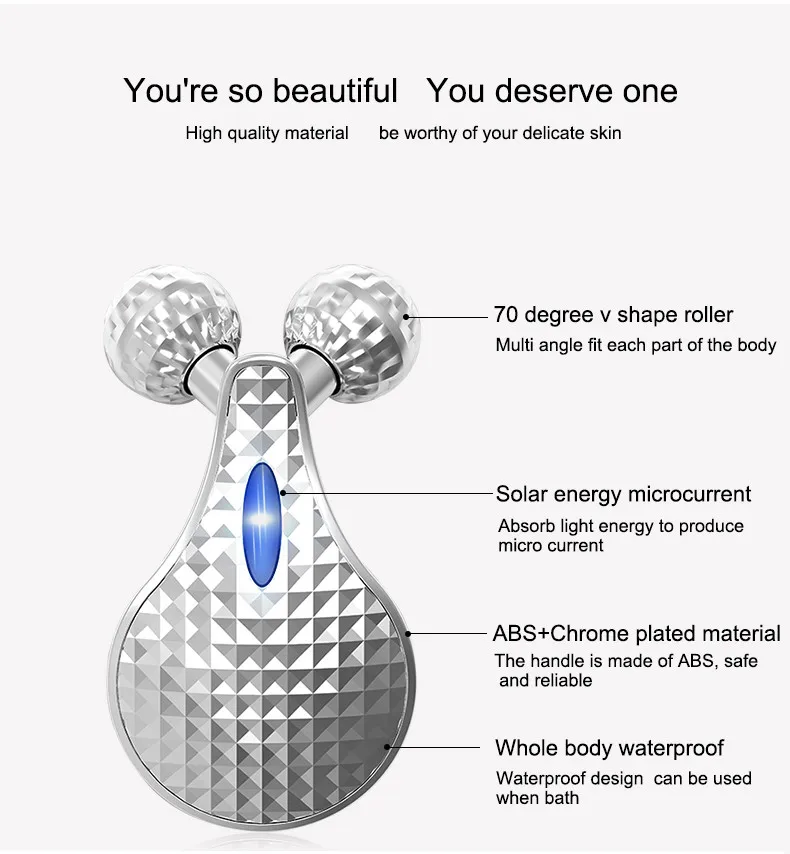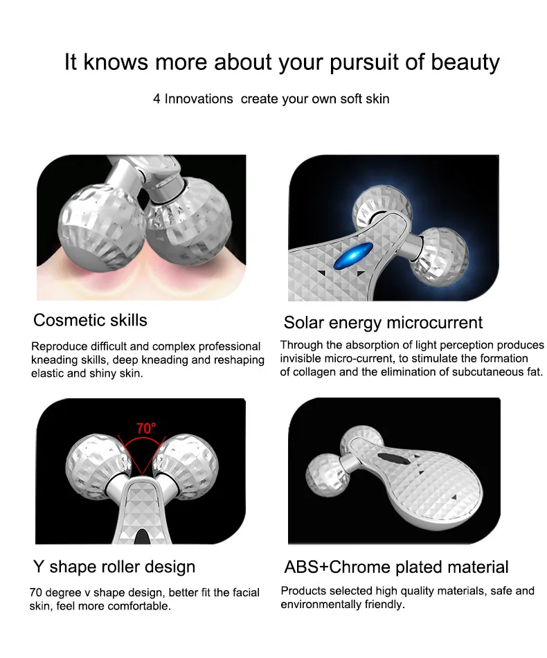 4 Innovations | 1.Cosmetic skills 2.Solar energy microcurrent 3.Y shape roller design 4.ABS+Chrome plated material |