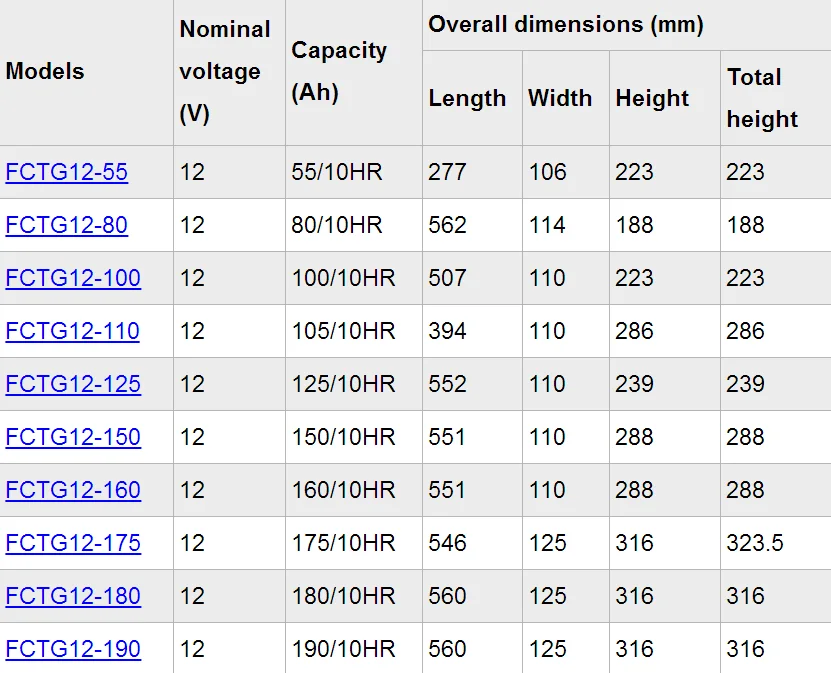 For front terminal GEL battery ,we have 12V 55AH , 80AH 100AH, 110AH,125AH ,150AH ,160AH , 175AH, 180AH ,190AH and 200AH capacity for your choice , Also GEL batteries and AGM Batteries are available .