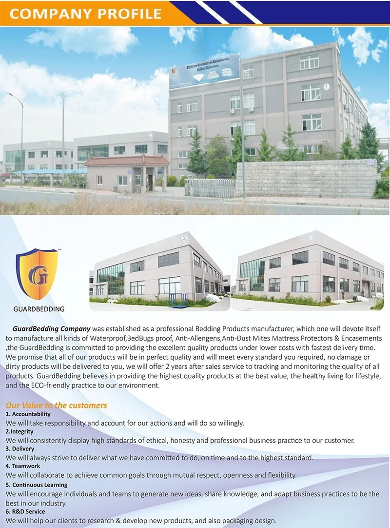 Guard Bedding Company was established as a professional Bedding Products manufacturer, which one will devote itself to manufacture all kinds of Waterproof, Bed Bugs proof, Anti-Allengens, Anti-Dust Mites Mattress Protectors and Encasements, the Guard Bedding is committed to providing the excellent quality products under lower costs with fastest delivery time.