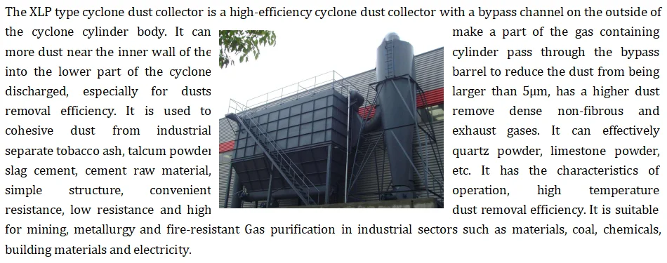 1. According to the XLP type bypass cyclone dust collector air way classification. Type X (horizontal air outlet, suction-type dust remover is located on the suction side of the fan and has an outlet volute), generally used for negative pressure operation; Y type (upper air outlet, press-in dust collector is located on the press-in side of the fan), Generally used for positive pressure or negative pressure operation.