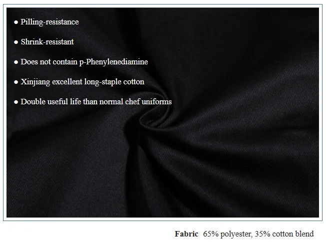 8. Working life is 2Times of The Ordinary Chef Uniform 9. No Pilling For Ever 10.Eco-friendly, Free of phenylenediamine carcinogens 11.Fabric certification: OEKO-TEX Standard 100. 12.Wash-resistant Chef Clothing:Products can be washed 200 times