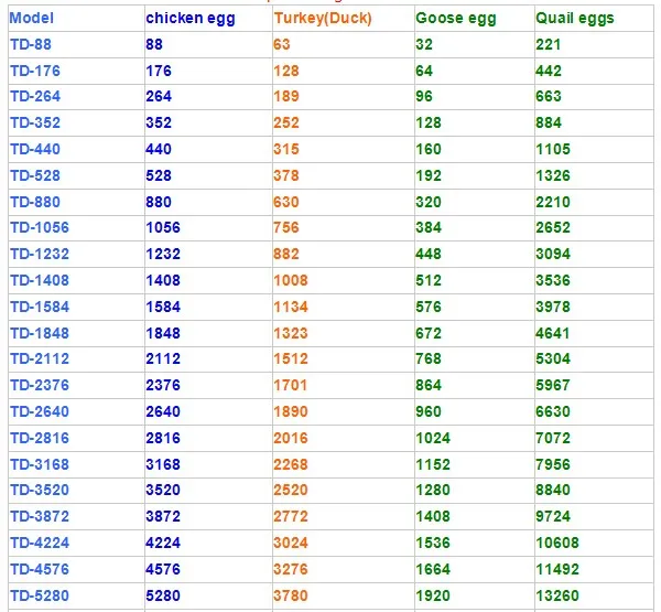 Poultry Name | Egg Capacity (pcs) |