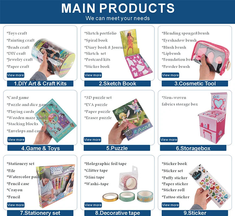 various Kids' products such as DIY art & craft kits, Sketch Book,cosmetic,Game & Toys