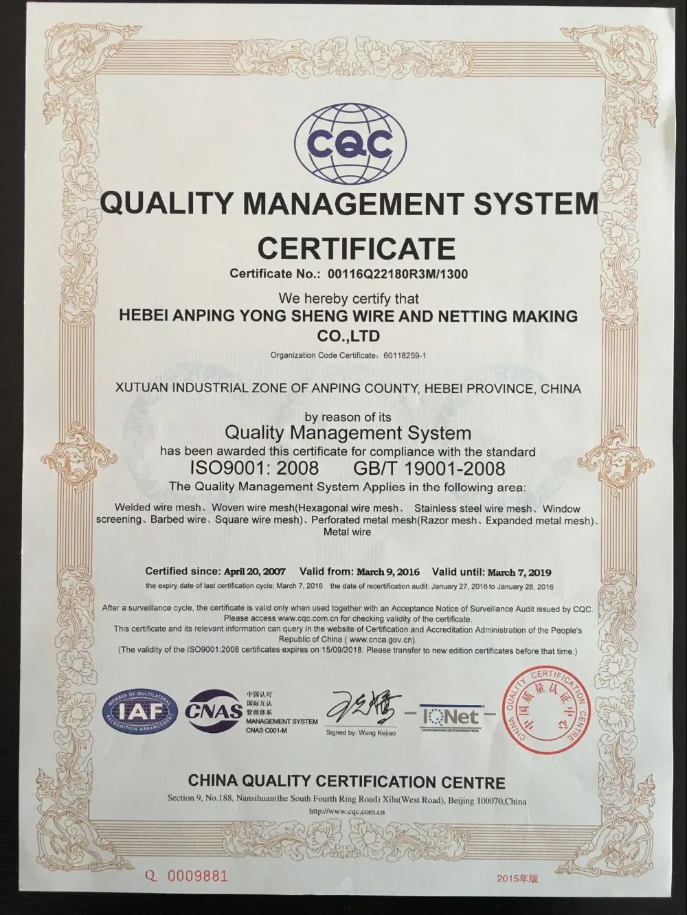 Hebei Anping YONGSHENG wire and neeting making co.,ltd , (Founded in Anping city 1990) is a leading manufacturer specializing in the wire and mesh products with ISO 9001:2008 CERTIFICATE . 26 YEARS MANUFACTURE HISTORY , 15 years exporting experience . Factory occupying area :66000 SQM , annual exporting output of factory :910*20 FCL .