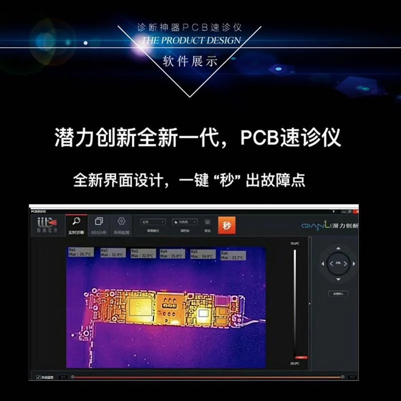 PCB quick diagnostic apparatus is a new generation of maintenance equipment, which is the world's first to use dual-spectral interleaved positioning technology. Through powerful PC-side intelligent analysis software, the use of intelligent algorithms, it can detect the motherboard chip operating temperature by the use of intelligent technology. By the normal / abnormal motherboard comparison analysis, it can quickly and accurately identify problem chip, which can assist maintenance personnel in overhauling the problem board, greatly improve the efficiency and maintenance accuracy.