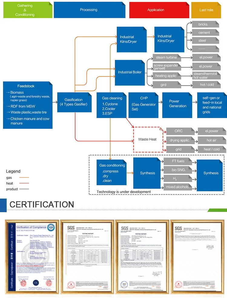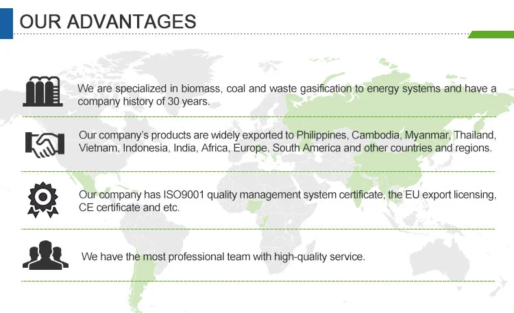Our coal gasification process includes three steps. The First step is coal gasification, which convert coal into syngas. The Second step is syngas purification. The producer gas coming from gasifier usually contains contaminants including dust, coke, tar and etc. The contaminants will be removed by the purification system to ensure normal operation of gas engine. The Third step is power generating in gas engine. The high temperature exhaust gas may be reused by waste heat boiler to generate steam or hot water for civil or industrial use). Steam turbine may also be considered to make a gas-steam combined cycle power plant, which will increase the total efficiency.