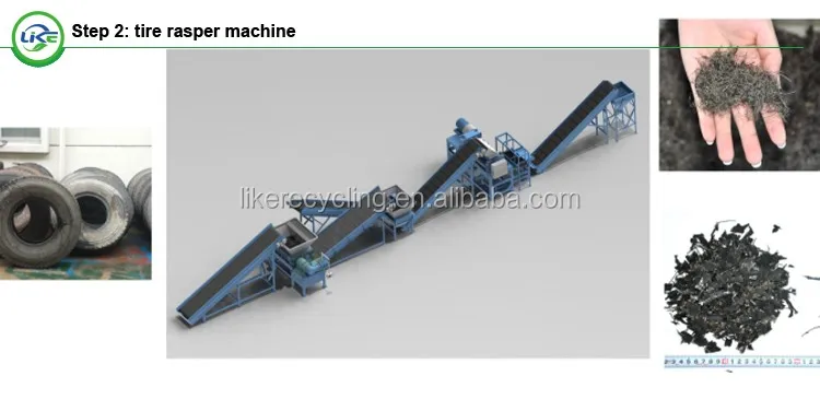 the second step is lk-R series tire rasper machine, is used to make the rubber mulch in 10-30mm. it can be colored rubber mulch as filler of lawn or garden.