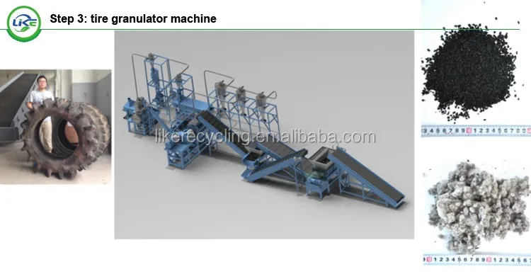the Third step is LK-G series tire granulator, is used to make the crumb rubber or rubber granules without wire and nylon. it is third step in whole tire recycling production line.