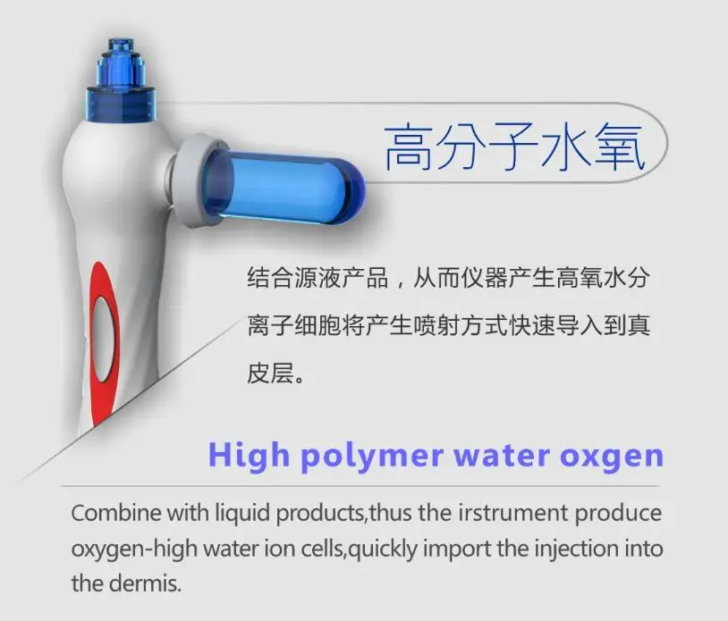 The water & oxygen jet facial machine uses oxygen under extreme pressure and water, takes tiny water drops, through spray-type to act on skin. It can penetrate nutrient components to pores and cracks of skin from the epidermis to dermis layer, then promote rebirth of cells, rapidly and directly supply rich nutrient for skin. Simultaneously, it can clear deep dirt in epidermis. Oxygen of extreme pressure and nutrient liquid can stimulate the rebirth of fiber tissue in dermis, make cells metabolism. So as to improve skin dark, yellow, chloasma, get good effect of wrinkle removal, skin rejuvenation and etc.