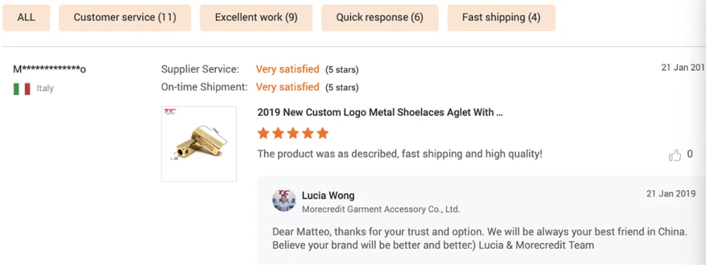 Send your detailed request of the custom metal aglet cord → Feedback with quotation → Confirm quotation & make payment → Make artwork for approval→Make mould→Mold test→Making samples