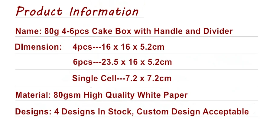 This Paper Cake Box is made by high quality whitecard paper. This cake box has 2 sizes available, 4 designs. Also have a plastic clear bag to match. Please let us know if you need the bag. Professional manufacturing, quality and reliable products passing rate of 99%. We accept customer's design and sizes, feel free to talk to us.