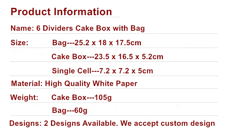This Paper Cake Box is made by high quality whitecard paper. This cake box has 2 designs available. Also have match bag, you can order seperately. Professional manufacturing, quality and reliable products passing rate of 99%. We accept customer's design and sizes, feel free to talk to us.