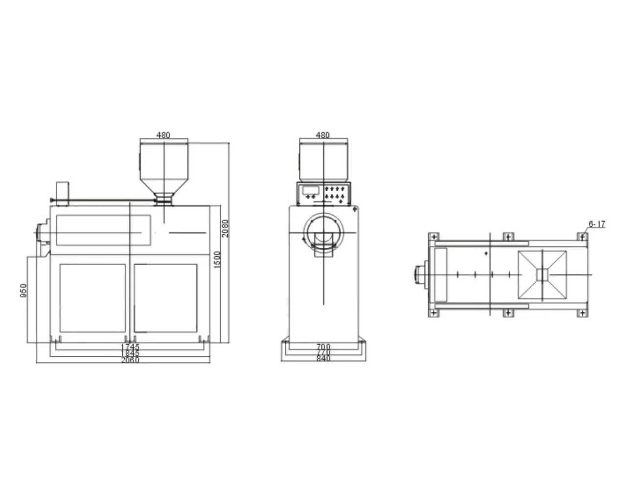 Model | Output (kg/h) | Power (kw) | Blower (kw) | Static pressure (pa) | Dimension (mm) | Weight (kg) |