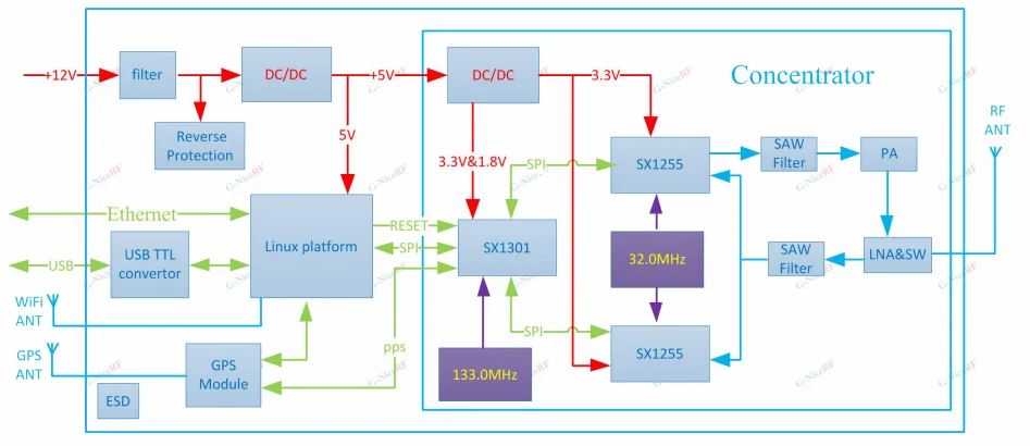 the host. The GPS module also output one pulse to the sx1301 per second. The gateway receives the RF data from nodes and sends to the server. It also receive data from
