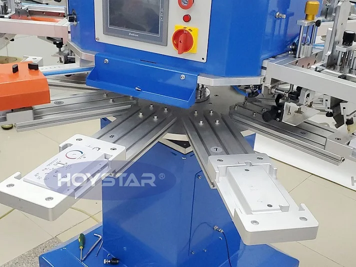 this machine can print different material panel, cover, case , t shirt, textile, koozies,sleeve, and print 4 color at one circle, just need to change pallets