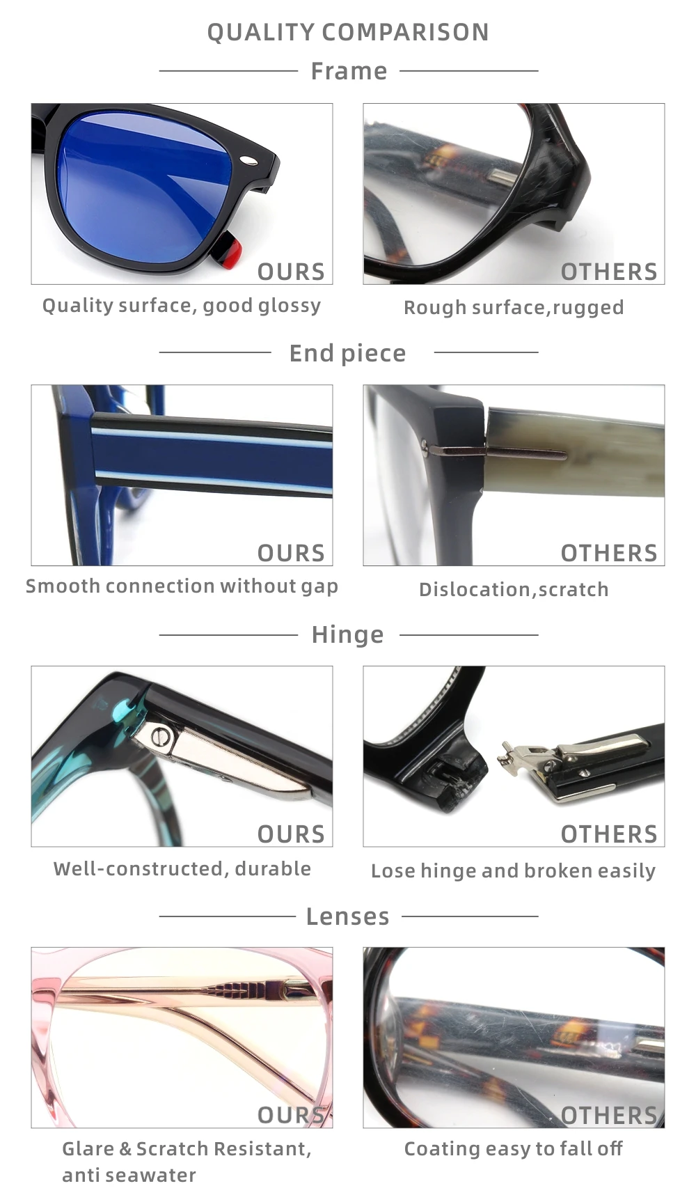 * Acetate belongs to high quality frame materials; normally used for top brand products, specially for the worldwide famous top eyeglasses brands