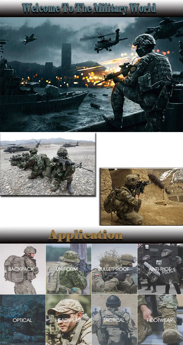 Our camouflage fabrics contain almost all patterns,suitable for wooden,desert,snow-ground,digital,emulate camouflage,for navy,for airforce as well