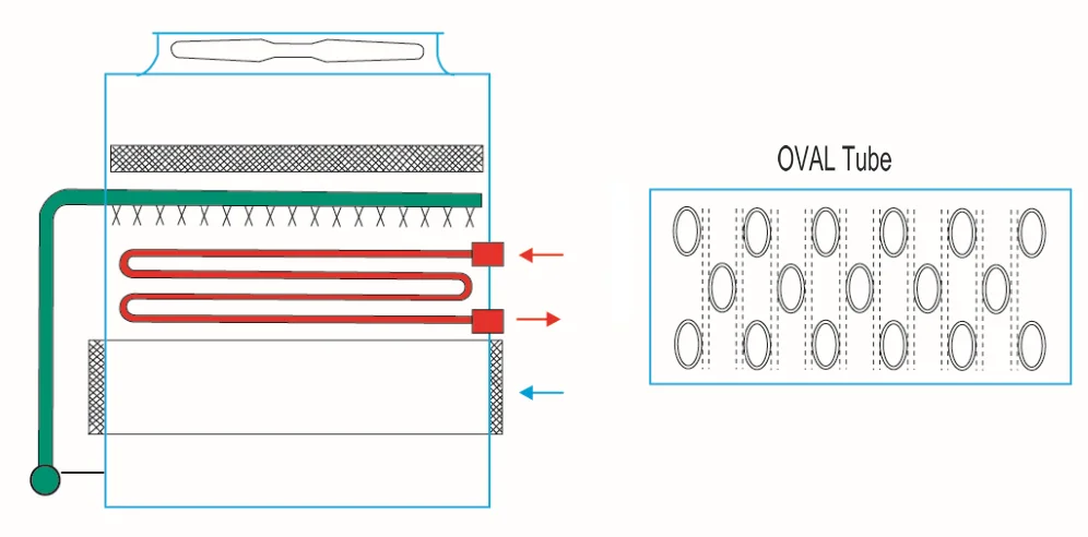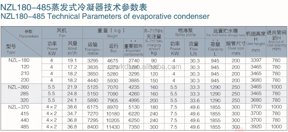 NZL series evaporative condenser is top counter blow design, only one time heat exchange, totally dependent on surface of cooling coil. Heat exchange coil apply seamless oval steel tube, tube pattern in compact space and smaller pitches, tube surface get larger in limited space. It extend water and tube heat exchange time and greatly improve thermal efficiency of coil.