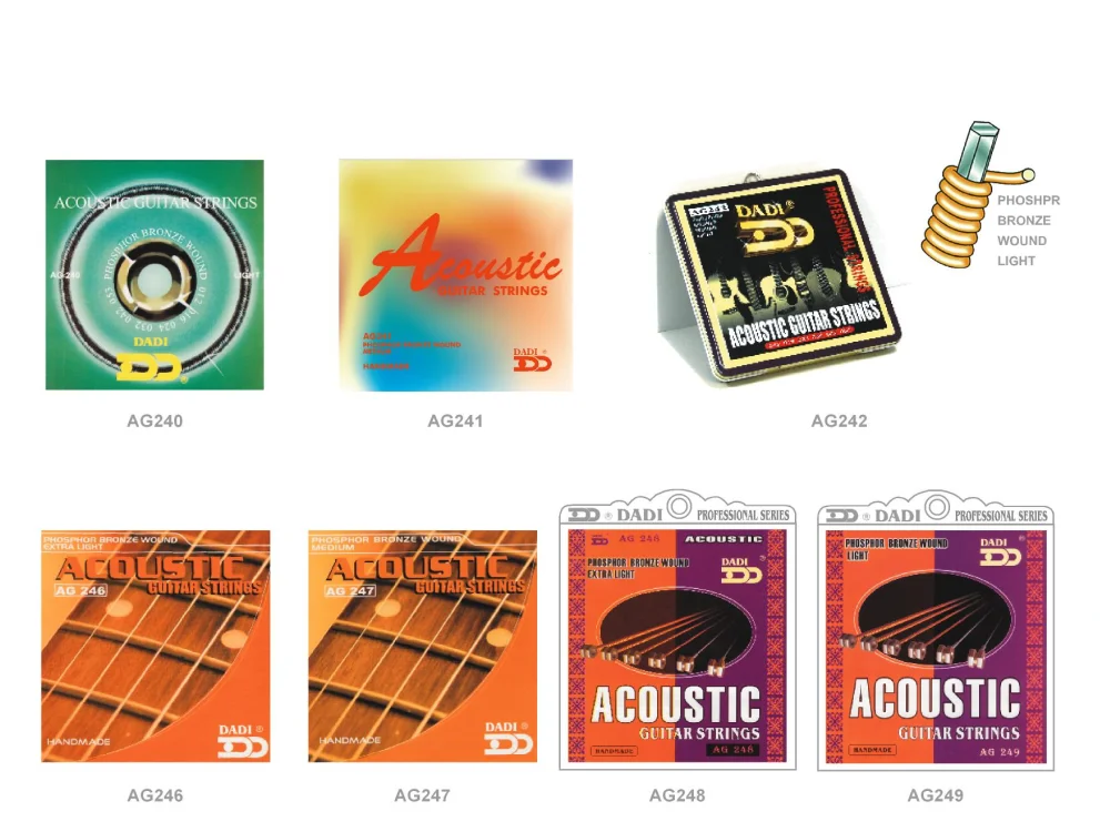 Manufactured from high grade phosphor bronze wire togther with hexagonally shaped steel core wire. The six edges of the core wire ensure a tight bond between the core and the wrap wire all along the length. Bright, long lasting and extremely durable.