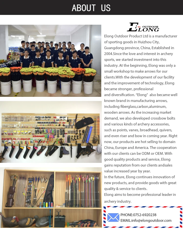 Founded in 2004, ELONG outdoor is almost first runner in arrow industry in China. We have two workshop to combine the arrow the capicity is 8000-10000pcs per day. We supply arrows for hunitng and sports, youth and adult usage, including fiberglass arrows, carbon arrows, aluminum arrows and wooden arrows. There are crossbow bolts and various kinds of archery accessories, like points, vanes, broadhead, quivers and riser and bow. Customised services could be offered.