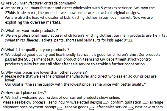 We own the 27kids trade mark and 4 full-function factories with modern equipment workshops and skillful workers , our output can be reached 1 million per month .