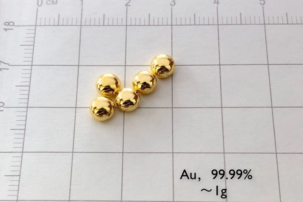 These beautiful pieces of solid Gold metal are melted in our own high temperature furnace. They are very high purity (99.99%) .