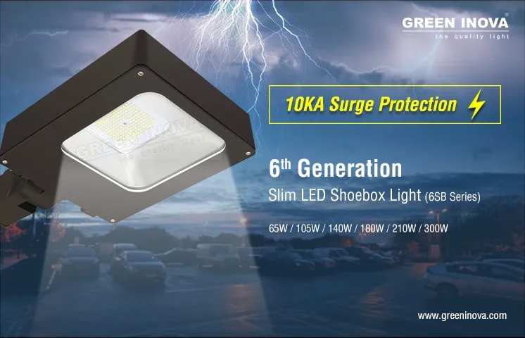 65W 105W 140W 180W 210W 280W LED shoe box parking lot lights are designed to enhance safety and free maintenance with 10KA surge protection as standard. It features toughened, UV stablized glass cover structure, more sturdy, solid for longer durability. Power option is upgraded to 65W/105W/140W/210W/300W, replacing High Pressure Sodium & Metal Halide fixtures of up to 1000W. It's a 360° energy saving solution with a long L70 lifespan of 100,000 hours.