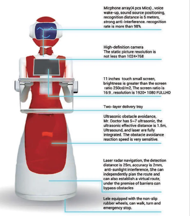 Functions overview: food delivery, welcome reception (optional), explanation, guide, shopping guide, marketing, consultation, entertainment interactive, promotional products, etc.
