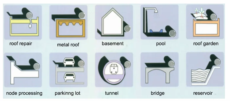 1.Underground waterproof building ,subway ,tunnel ,basement and so on. 2.Industrial and civil building ,swimming pool ,parking lot ,bridge ,reservoir ,canal ,especially used for the waterproof engineering which can not use the open flame