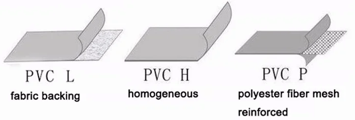 1. H--PVC : no reinforced and no backing material 2. L-PVC : surface with non-woven fabric 3. P--PVC : polyester fiber grid reinforced
