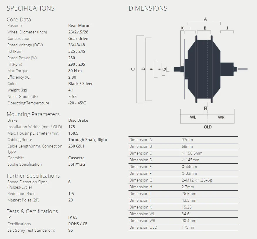 This rear-drive motor, which is compatible with the disc brake, has a rated power of 250W, a reduction ratio of 1: 5 and a maximum torque of 80 N.m, providing ideal power for vehicles. Strong and efficient, this motor, working together with a cassette or freewheel speed change mechanism, greatly enhances riding comfort and is suitable for beach buggies and snow bikes. It can be black or sliver.