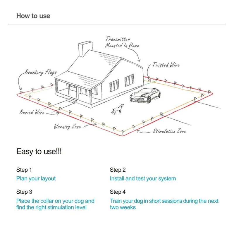 The In-Ground Electronic Dog Fence had been proven safe,comfortable,and effective for all pets over 8 pounds. The system works by producing a radio signal from the Fence Transmitter through up to 4000 feet of Boundary Wire.The Boundary Wire is buried or attaced to a fixed boject to enclose the Pet Area.You temporarily define the Pet Area with Boundary Flags for a visual aid in training your pet. Your pet wears a Receiver Collar with Contact Points that touch his neck,and,once trained,is allowed to roam freely in the Pet Area.When your pet reaches the Warning Zone,the Receiver Collar gives a warning beep. If your pet continues into the Static Correction Zone,a safe Static Correction will be delivered through the Contact Points to get his attention until he returns to the Pet Area.
