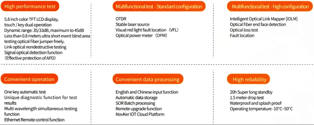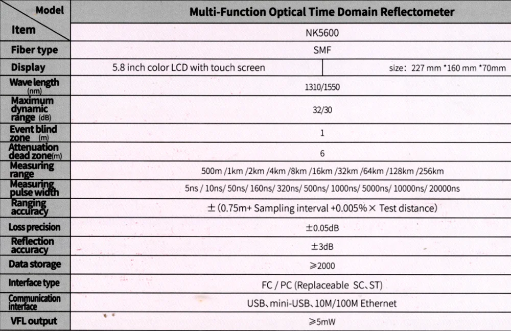 The NK5600 Optical Time Domain Reflectometer is a high-performance, multi-functional test instrument designed for the FTTx network. The product has a maximum resolution of 0.05m and has a minimum test area of 0.8m. This product integrates the OTDR/light source, optical power meter, and VFL functions in one body. It uses touch and key dual operation modes.