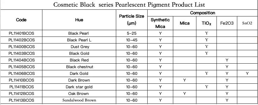 Below is our Cosmetic Black Pearlescent Pigment series .We also supply Cosmetic Crystal Silver white series, Cosmetic Crystal gold series ,Cosmetic Interference Series Cosmetic Diamond Dragon Pearlescent Pigment series, also other natural mica or Synthetic mica or glass substrate pearlescent pigments in other pages , welcome to enquiry!