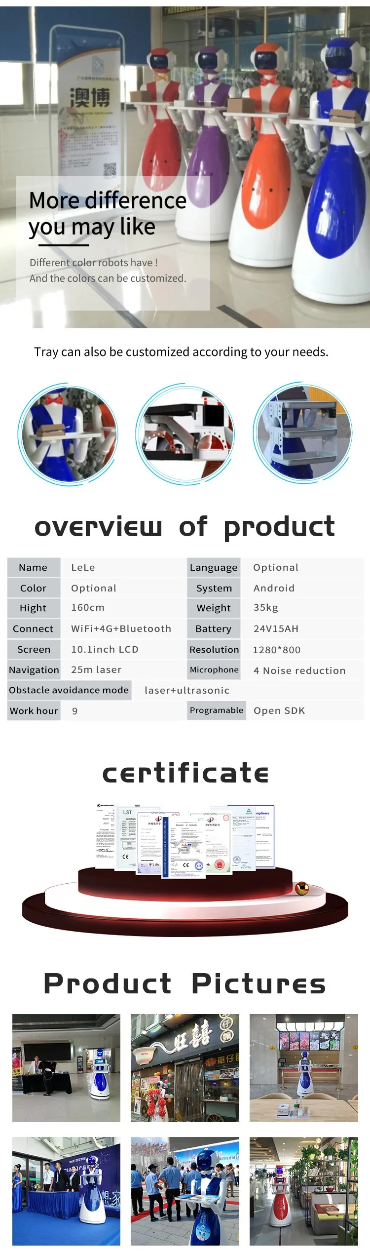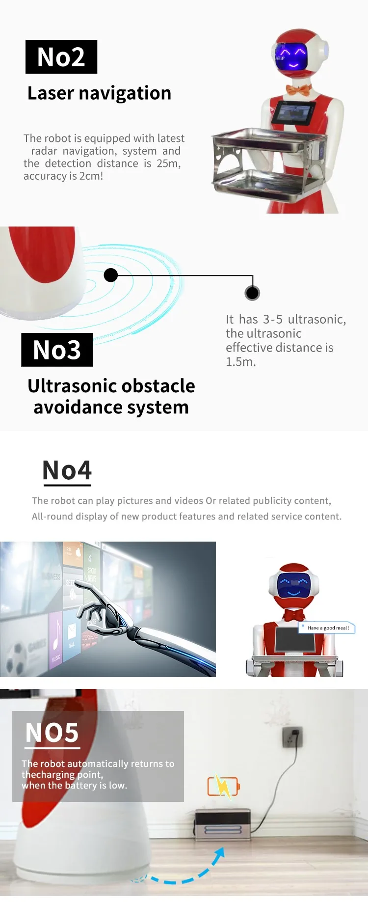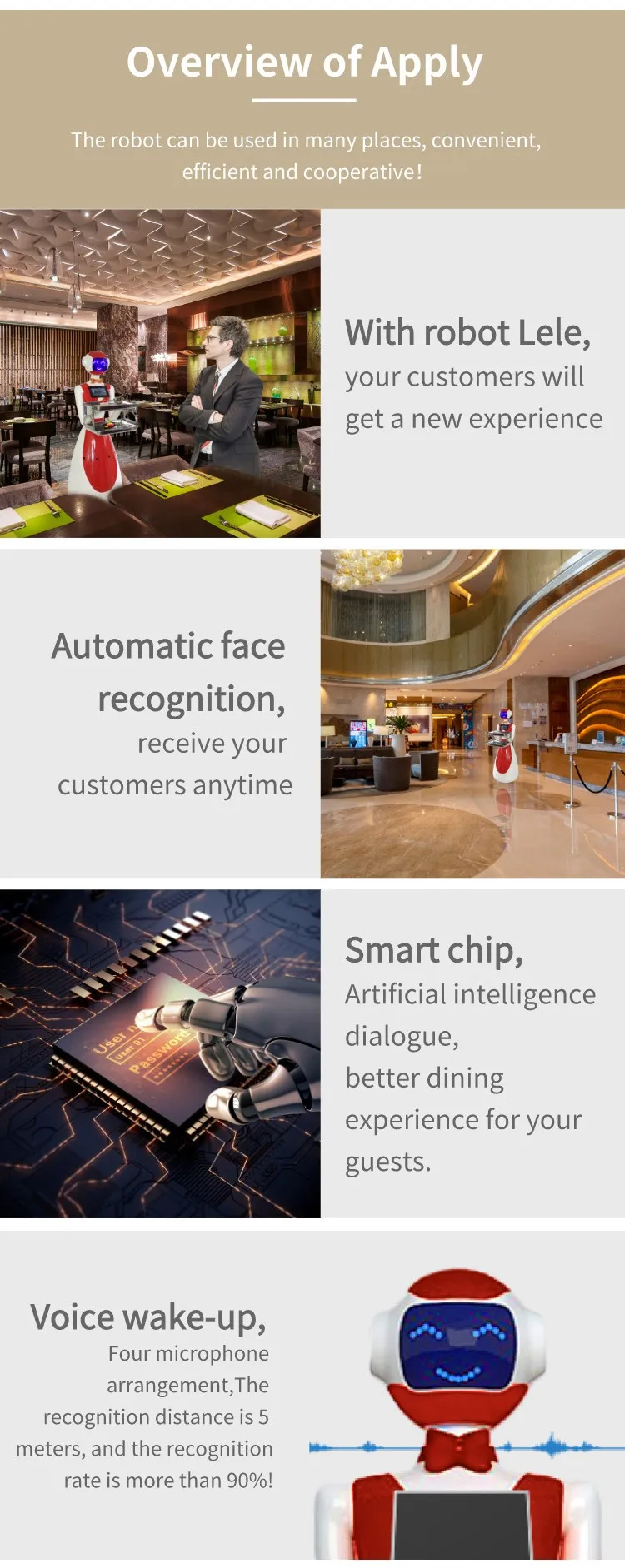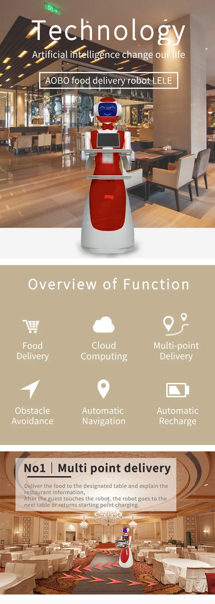 Functions overview: food delivery, welcome reception (optional), explanation, guide, shopping guide, marketing, consultation, entertainment interactive, promotional products, etc.