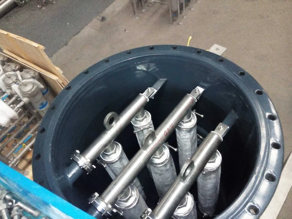 CFC Filter is mounted in a closed container. It is designed with multiple porous filter elements sheathed with filter cloth (or other filtering medium). Its main parts are the material tank, air storage tank, feeding pump, candle filter, pipes, valves, PLC electric control system.