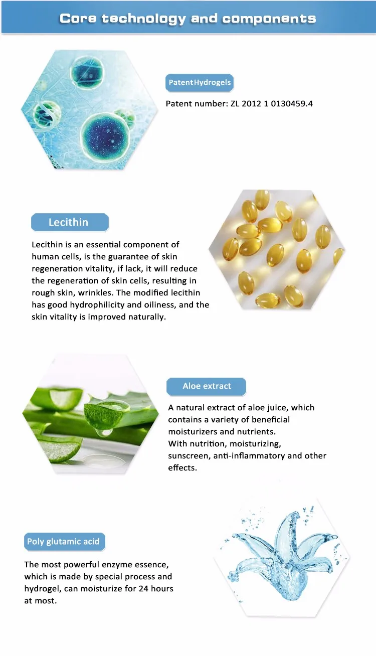 Main funtion ingredients: | Tocopherol Niacinamide Polyglutamic Acid Glycyrrhetinic Acid Sodium Hyaluronate Hydrolyzed Collagen Hamamelis Virginiana Extract Aloe Barbadensis Leaf Extract Etc. |