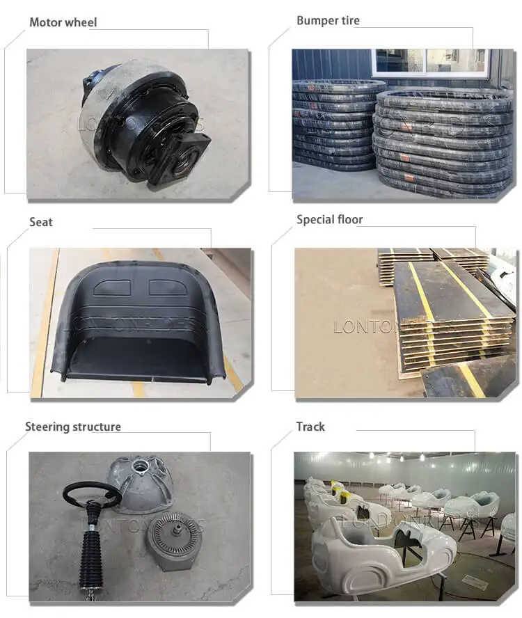 Lonton amusement rides manufacturer bumper car shell is made of gel coat (please read article for material introduction), compared traditional FRP material, it is more stable, beautiful and can use longer time. For bumper car collision bars, we choose the best quality, ensure it would never tire burst whole life if without artificial damage, ensure passengers playing safely and happily.